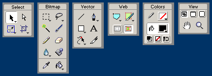 工具面版 新的工具面版(Tools Panel)將不同類型的工具分開排列,分別有選擇工具(Select)、位圖工具(Bitmap)、矢量工具(Vector)、網絡工具(Web)、顏色工具(Colors)、視圖工具(VIEw),這樣更方便用戶選擇恰當的工具來使用。