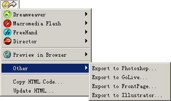 可以將已經創作好的圖形輸出為其他各種格式,甚至包括了一些Adobe公司和微軟的網絡制作產品的格式,或者快速啟動另外的Macromedia軟件來幫助創作,在菜單裡我們可以看到,除了三劍客之外,Freehand和Director的MX版本也即將推出。
