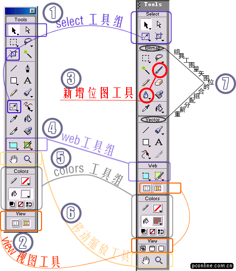 3、增強的工具面板。在FW4,我們就已經發現了MM公司已經有意識的在工具面板的布局上做了一些相應的歸類擺放;在FWMX中,我們可以發現工具箱的分類更加詳細了——Select選擇工具組、Bitmap位圖工具組、Vector矢量圖工具組、VIEw視圖切換等等……,為了便於大家的理解,我們可以通過下面的圖片來直觀的理解一下FWMX較FW4的不同之處: