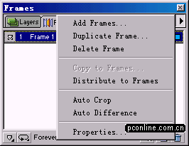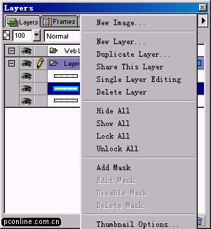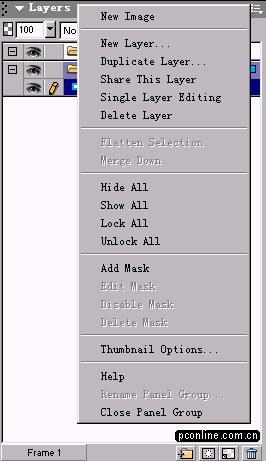 FWMX的層面板發生了兩個較明顯的變化:一是左下角新增了一個Frame桢數選擇按鈕,一旦文件出現多桢的情況,我們就可以點擊這個按鈕,在彈出的下拉列表中直接進行桢的選擇,省卻了我們再次切換到桢面板的麻煩,對於習慣用FW做動畫的朋友來講,應該說是一個方便的小工具;二是面板有上角的彈出菜單發生的變化:增加了 Flatten Selection (轉化為位圖)和 Merge down(向下合並層)兩個命令,使得合並圖層變得更加容易,而且通過實踐我們可以發現,Merge Down命令可以實現矢量圖、位圖的合並操作,並且合並為位圖模式。應該說層面板的確是在實用性、方便性上有了很大的增強!