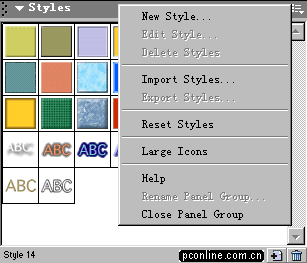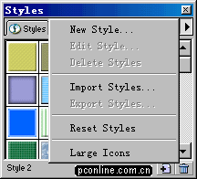FWMX的風格面板相比較FW4的面板來說,彈出菜單中增添了一個新的命令:Large Icons大圖標顯示^%#@$%什麼意思?就是可以將范例的風格圖標采用大圖標的形式顯示出來,對於眼神不太好的朋友可是大大的福音啊!嘿嘿~~~~~~(讀者:看了半天你的破文章,眼好也得給累壞了……)罪過罪過!!廢話不講了,這個功能對於我們研究一些風格的紋理構成應該是有一定的幫助的!