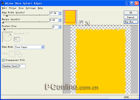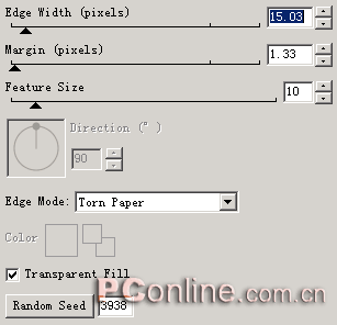 【注意】:如果在進行上面的第3步操作時,不執行相應的菜單命令,而是直接對面板上的各個參數進行調整的話,矩形的邊緣又會產生另外的一種效果。Edge Width、Margin和 Feature Size三個選項的各項參數設置如下圖所示,將Edge Mode選擇為 Torn Paper選項, 並同時選擇“Transparent Fill ” 前面的復選框。單擊Random Seed 按鈕,每單擊一次,其後面文本框內的數值就會發生相應的變化,而與其相對應的預覽框內的矩形對象的邊緣效果也會發生相應的變化。