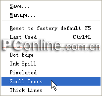 3、選中矩形對象,執行屬性面板上的效果菜單命令中的Alien Skin Splat LE濾鏡中的Edges效果命令,在彈出的AlIEn Skin Splat! Edges設定窗口中,選擇菜單命令“Settings | Small Tears”,如下圖所示。