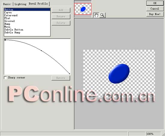 3、選中變形後的對象,執行PropertIEs屬性面板的Effects ---> Eye Candy 4000 LE ---> Bevel Boss 效果命令,在彈出的設置框中進行設定:Basic選項不用進行修改了,直接采用默認值即可;Lighting選項也采用默認值;Bevel Profile選項選擇最上方的“Button”預設選項,點擊確定即可,具體設定,請參看下圖:
