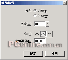 3、選中打散的文本對象,選擇菜單命令“修改|改變路徑|伸縮路徑”,在彈出的“伸縮路徑”設置框中進行如下圖所示的設定。