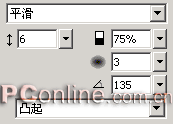 5、按“Ctrl+A”組合鍵,接著按“Ctrl+G”組合鍵,將兩個對象組合為一個群組對象。接著選擇屬性面板上效果菜單中的“斜角和浮雕|內斜角”效果命令,在彈出的設置框進行如下圖所示的設定。