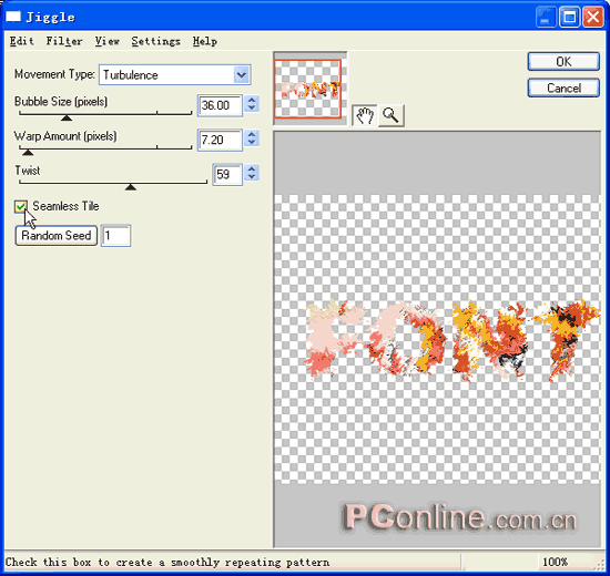 4、選中編輯區的蒙版組合對象,選擇屬性面板上的效果菜單中的“Eye Candy 4000|Jiggle”效果命令,在彈出的“Jiggle”效果設定框中進行如下圖所示的設定。注意將Twist的數值要設置的盡量大些,以使最終的效果更為逼真,而且要選中Seamless Tile前面的復選框,還可單擊Random Seed按鈕來獲得隨機的邊緣處理效果。