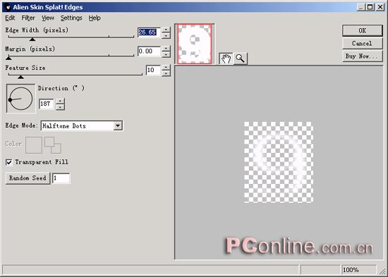4、選中克隆對象,選擇屬性面板上的效果菜單中的“Alien Skin Splat LE | Edges……”效果命令,在彈出的AlIEn Skin Splat Edges設定窗口中,進行如下圖所示的設定。最終效果的形成與“Edge Width”和“Feature Size”兩項數值的設定是有很大關系的。