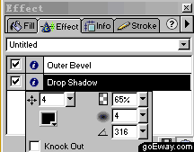 六、 還是在effect面板中,在下拉菜單中選擇shadow and glow->drop shadow,並進行如下圖一樣的設置。