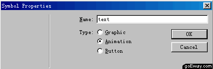 五、此時按路徑排列的文字處於被選擇狀態。按F8鍵,在彈出的符號屬性窗口中設置這個動畫的名字為text。類型為animation,點擊OK按鈕確認。