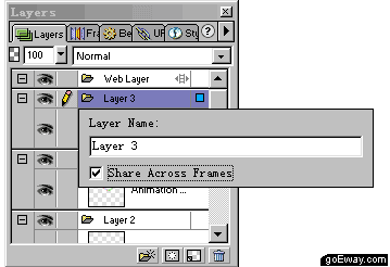 十四、雙擊層標簽,在彈出的對話框中選中Share Across Frames,使其前面有個鉤,表示層共享。在緊接著跳出來的Fireworks4警告窗口中點擊確定按鈕。用同樣的方法,把Layer2也進行共享。