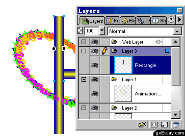十三、在Layers面板中選擇Layer3。按下Ctrl+v,粘貼剛才所復制的漸變色矩形,用指針工具移動到如下圖所示的位置。因為Layer3處於目前的最高層,所以它在所有對象的上面,覆蓋住了文字層。