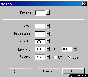 八、全選這二個圖形,按F8鍵,在符號屬性對話框中設置符號類型為animation。單擊OK按鈕。在緊接著跳出的動畫窗口中,進行如下設置:frames幀數為30,其他地方不改,最下面一個選項rotate,設為355度,方向為CCW,當然你也可以選擇CW,隨你自己喜歡吧。單擊OK按鈕表示確定。CW是指順時針旋轉,CCW是指逆時針旋轉。