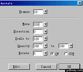 八、按F8鍵,在符號屬性對話框中選擇其類型為animation。點擊OK按鈕。在緊接著跳出來的動畫窗口中再進行如下設置。Frames設為10幀。Move選項設為200(隨便設置一個數字好啦)。Scale to 選項中填入120。點擊OK按鈕表示確定。