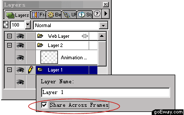十、最後一步啦,打開Layers面板,選擇Layer1標簽,雙擊。在跳出的對話框中把Share Across Frames前面的鉤選上。使圖層1進行共享。