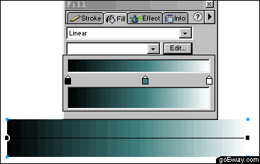 六、在fill面板中,對這個矩形進行填充顏色的編輯,類型為linear。點擊edit按鈕,對顏色面板進行設置,從左到右依次是黑 > 綠 > 白。