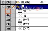 再給這一路徑隨便取個名子,就叫“W1”吧,然後把該路徑再復制一個,取名為“W2”並把“W2”所在對象層的“眼睛”暫時關閉。因為一會我們還要用“W2”這個路徑去“切割”另一個對象,所以暫時將“W2”進行保留。