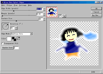 在菜單欄選擇Filters選擇項。你會發現與Fireworks4.0相比,增加了一種濾鏡類型:AlIEn Skin Splat LE,選擇它,出現子菜單edegs,這是一個用來調整圖形邊緣的濾鏡。單擊它,進入功能界面(如圖2)。