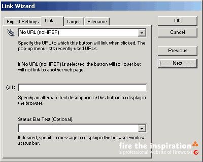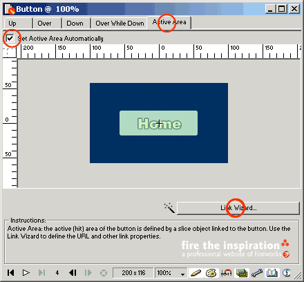 最後,我們切換到Active Area,在這裡可以設定與鏈接有關的參數,所有設定的內容最後都會輸出成標准的Html代碼,我們要做的只是簡單的將輸出的代碼復制到網頁中的相應位置。Set Active Area Automatically會自動設置一個切割,切割的大小與按鈕的大小是一致的,建議使用這個設置,然後點擊Link Wizard進行最後的設置。