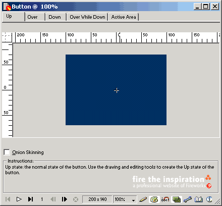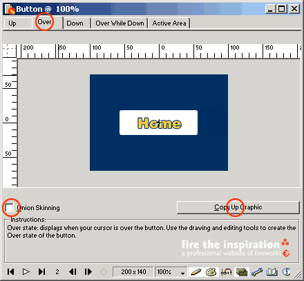 切換到Over狀態下,點擊Copy Up Graphic,Fireworks直接將Up狀態下繪制的圖形復制到Over狀態下,並會保持所有的可編輯屬性,如果你需要更精細的加工,可以打開Onion Skinning使Up狀態下的圖形淡淡出現,以做參考。在這裡,我們將Home字體的顏色改變。
