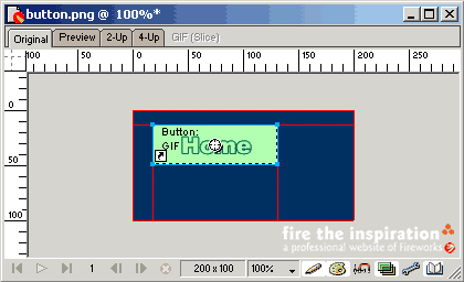 一切都完成後,我們關閉按鈕編輯器,回到通常的編輯界面,這時可以看到畫板上出現了一個帶有切割和熱區的按鈕,選擇這個按鈕,在左下角會出現一個小箭頭,這是符號(symbol)的標記,因為按鈕正是符號的一種。你可以移動這個按鈕到你希望的位置。切換到prevIEw狀態,你可以馬上看到這個按鈕的效果。