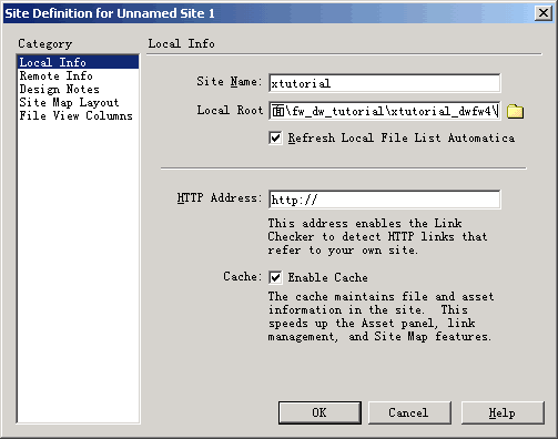 - 在Site Definition對話框裡,確定在Category列表中Local Info處於被選中的狀態。