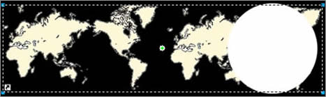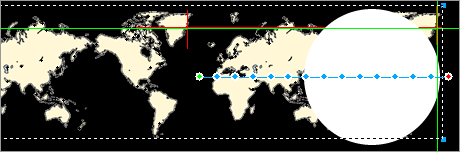 step7:退出符號編輯狀態,在主動畫文件中,用鼠標拖動綠色的點(第一幀),使圓形和地圖的位置如圖7所示。然後用鼠標點擊紅色的點(最後一幀),保持水平拖動使其位置如圖8所示。使用適當的輔助線和放大視圖會使你更好的完成這一步,這一步很關鍵也很麻煩,一定要有耐性,只要能調整准確他們的位置,就能保證動畫的流暢。