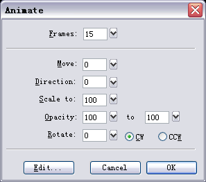 Modify/Animation/Animate Selection...”(快捷鍵“Alt+Shift+F8”),出現如圖5的對話框,將Frames參數設為15。該參數的設置有一定的原則,如果太小,地球轉動就會不夠流暢;如果參數過大,雖然動畫效果比較流暢,但文件的尺寸會比較大,所以大家最好根據作品的用途及環境設置該參數。