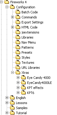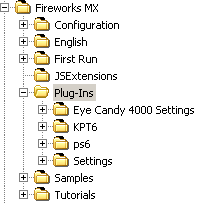 於是我按另外一種方法,直接將ps6裡的plugin文件夾復制到了fwmx的相關目錄裡。停,我怎麼找不到了?原來,fwmx的目錄結構與以前有些不一樣了,原來在fw4以及以前版本中濾鏡是放在configuration/xtras目錄下的(如下圖)