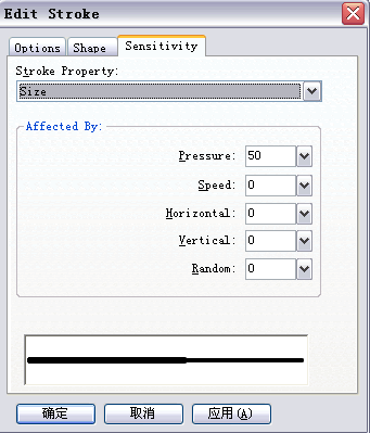 在彈出的Stroke Option對話框中,設置筆觸的寬度(Size)為5,點擊下方Advanced按鈕,在彈出的Advanced...面板的Option選項卡中設置Tips為10。點擊Sensitivity選項卡,設置其中的Press為50%(如圖7)。