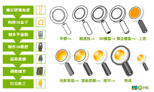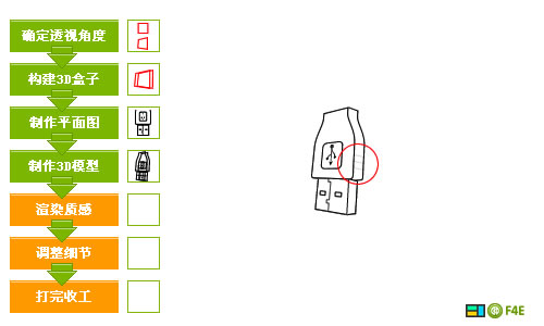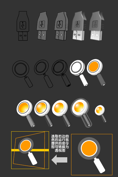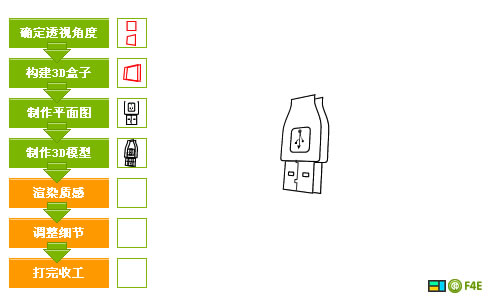 上面為制作的流程和最終效果圖。首先我要說的是。Fireworks本身不帶直接透視功能,不過有透視輔助線(其實也不太方便)和3D插件,但是直接做能夠更好地練習透視能力。我這裡畫的整套圖標都是同一個角度透視的,所以我采用一個正方形而不是這個USB插頭本身,主要是為了適應更多圖標。