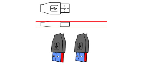 看看這個圖片,上一步做的東西真的失真了嗎?沒有呀!但是真的有點怪怪的——原因是我們把USB插頭的金屬部分和塑料部分放在一個面上了。再仔細看看上圖。側面來看其實不是在一個面上的。怎麼讓他們各自到各自的面上去呢?這個只有靠感覺去微調一下了。藍色的面向右移動一象素,紅色的面向上移動兩象素,左一象素。