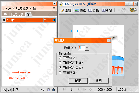 5,然後選中你要移動的物體,你看本例是選中的下面的矩形,注意了 是矩形而不是整個蒙版,然後復制一幀。(圖5)