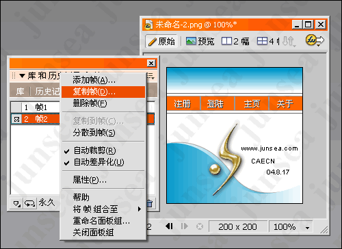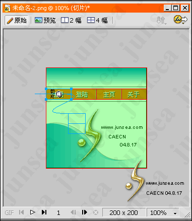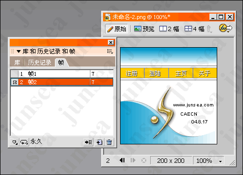 1,新建一個200*200的畫布 畫成如圖樣子 要注意的是 圖上的橙色的條是由4個50象素寬的條組成,然後復制一幀,如圖。(圖1)