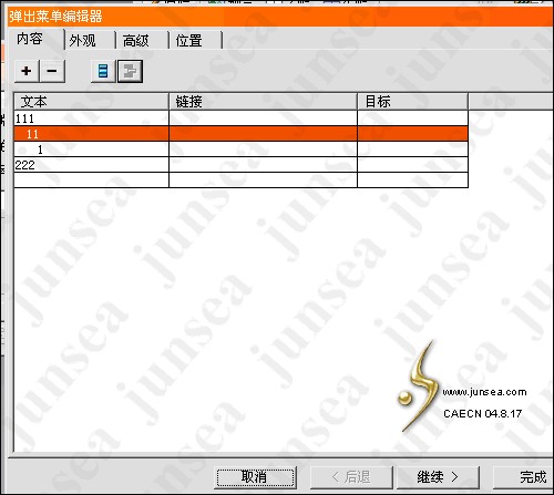 6.現在讓我們來做下拉菜單,同樣的用右鍵點某個切片,選擇下拉菜單會出現如圖畫面,在內容中,你先要想好一共有些什麼欄目,他們的從屬關系又是怎麼樣的,我建議自己先畫一個這樣的類似站點地圖的圖案,然後開始新建一系列的菜單。按圖中的“+ -”號旁邊的兩個圖標可以調整各欄目的隸屬關系。在外觀中可以設定下拉菜單的風格,大小,字體等。在高級中有關於下拉菜單的高度寬度等設定。(圖6)