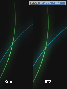 我們按照前面的方法做一條藍色的曲線光束。與之前那條綠的交叉。這時我把沒有添加疊加圖層的圖放在旁邊對比一下,你就能看出來區別了。有疊加圖層的交叉部分更“亮”一些,這就是我們需要的細節。