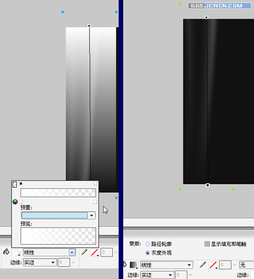 接著,在這個路徑上方新建一個白色矩形,選擇放射狀漸變填充,不要邊框,如圖: