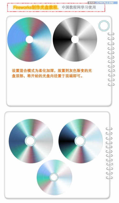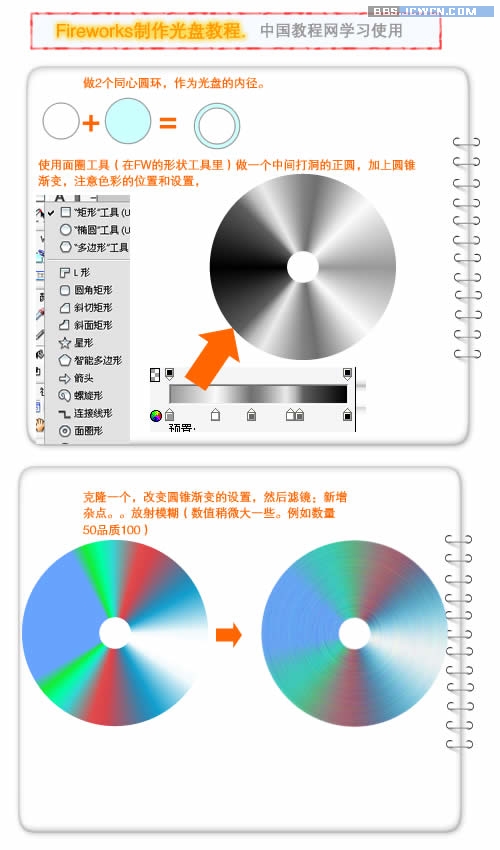 做2個同心圓環,作為光盤的內徑。做一個正圓,克隆一個稍微變小一些。加上圓錐漸變,注意色彩的位置和設置,然後濾鏡:新增雜點。。放射模糊(數值稍微大一些)