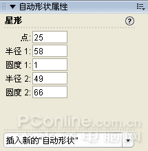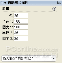 2、在“自動形狀屬性”面板上,單擊“插入新的自動形狀”下拉菜單,選擇“星形”,對於“星形”自動形狀對象的屬性,做一個設置,將“點”設為25,其余各項保持默認設置即可。