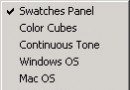 活動色彩框的右上角有個三角形的按鈕,點擊它我們會彈出色彩樣本面板菜單,如圖4所示。它分為兩部分,上邊第一個標題是“Swatches Panel”表示“色彩樣本”,它下面
