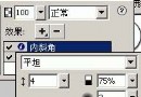 內斜角參數:斜角邊緣形狀為“平面”、寬度為4、對比度為75%、角度為135、按鈕預設為“凸起”。 投影效果參數:距離為15、透明度為65%、柔化為6、角度為3