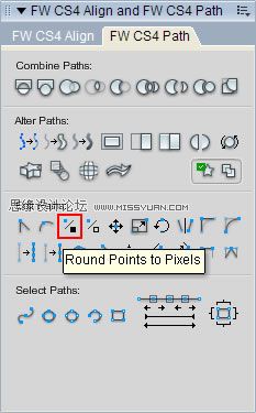 我們不能用Stroke去給矩形加外邊框,因為虛邊會把你給搞死。如果你用Rounded Rectangle工具畫出來的圓角矩形已經出現了非Stroke虛邊,那就把節點打散後,用黑色箭頭工具選中那個Path,點擊路徑面板的Round Points to Pixels把路徑的所有節點歸位到像素交點(也可以用白色箭頭工具選中某個節點單獨進行歸位)。