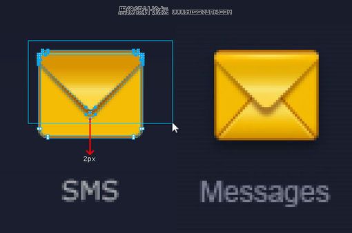 Step 04:用白色箭頭選中途中所示那些節點,然後用鍵盤的方向鍵往下挪兩個像素,這樣使信封看起來長一點(因為這裡單個圖標不受整體風格約束)。