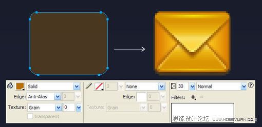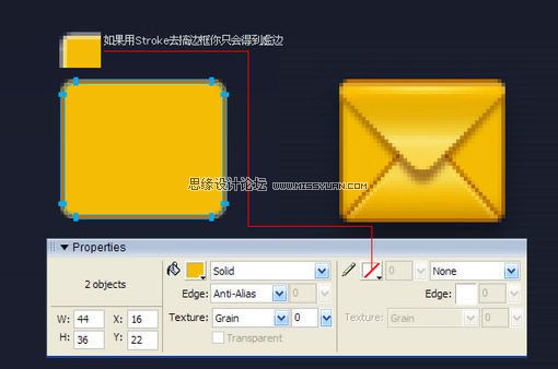 Step 13:因為背景是比較深的顏色,我們可以考慮加個發光。這裡我們不去用FW的投影或發光濾鏡,還是用Path,為什麼?因為比較好控制,個人喜好吧。我們可以做一個比信封底層的圓角矩形上下左右多1px的新圓角矩形,不羽化,透明度30。