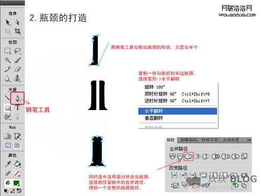 接著,我們開始制作瓶頸,用鋼筆工具勾畫出半個瓶頸的形狀,通過復制-水平翻轉,得到右邊半個,這樣制作的瓶頸看起來對稱平整,比完整勾勒的更好。用路徑面板中的組合路徑拼合他們。