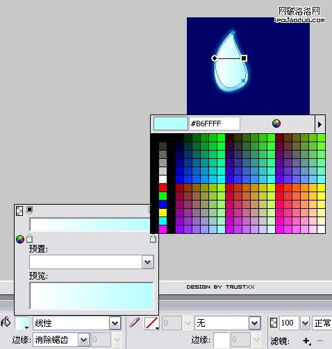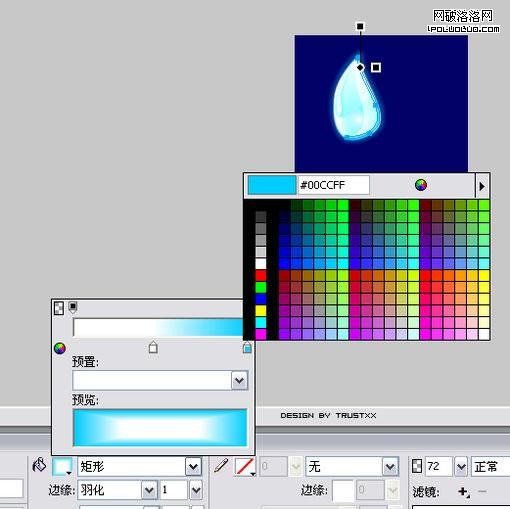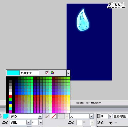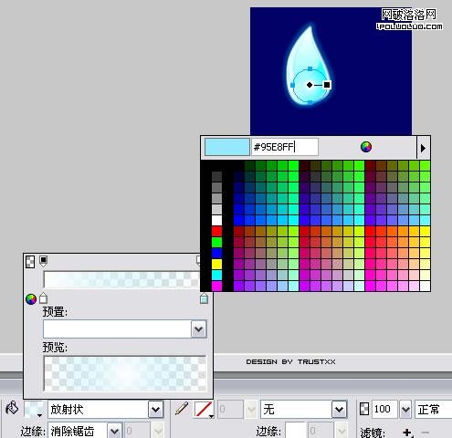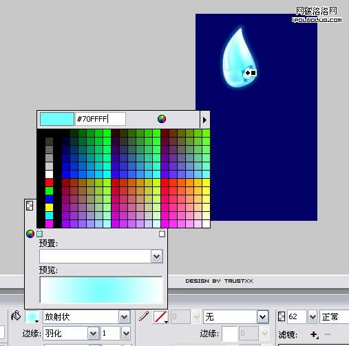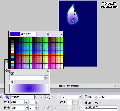 隨意新建一個畫布,填充背景色為#000066,鋼筆勾出基本形狀,羽化邊框(半徑1),填充放射性漸變,外加濾鏡外發光,效果如圖:
