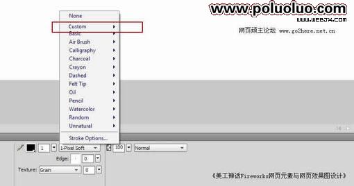 1、自定義筆刷,Fireworks CS5終於能夠像他的老大哥PhotoShop那樣自定義筆刷樣式了,甚至在Fireworks CS5中可以導入PhotoShop和illustrate所定義好的筆刷效果。