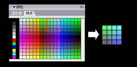打開樣本面板後,按下鍵盤的PrintScreen鍵,然後ctrl+v粘貼,使用“矩形選取框”在圖片上截取一個4×4格子的顏色格子,然後將這個顏色格子轉換為圖形元件。