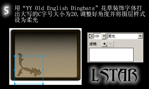 5.用“YY Old English Dingbats”花草裝飾字體打出大寫的C,字號大小為20,調整好角度並將圖層式樣設為柔光。