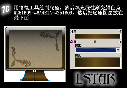 10.用鋼筆工具繪制底座,然後填充線性漸變顏色為#251B09-#6A4E1A-#251B09,然後把底座圖層放在最下面。